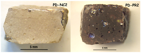 Glass tesserae comes from one of the only two palaeo-Christian mosaics known in the Veneto region (Italy), i.e., the one which originally decorated the votive chapel of St. Prosdocimus located in the basilica of St. Justine in Padova. These tesserae are 6th century AD in age and are characterised by a full range of colours (blue, yellow, orange, red, brown, green, white, and “gold”) [16,17,18]. Manganese-containing inclusions are detected in all the tesserae of chromatic groups “light brown/amber” (NC) and “purple” (PR) for a total number of 10 tesserae (Figure 1). These tesserae were characterised from the archaeometric viewpoint with particular attention to identification of glassy matrices, opacifiers and colourants, and detailed results are reported in Silvestri et al. [18] and summarised in Table 1.