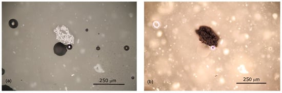 Micro-textural characterisation of manganese-containing inclusions dispersed in the glassy matrix was carried out by OM and SEM-BSE analyses. In “light brown/amber” (NC) and “purple” (PR) tesserae, the inclusions are sporadic and small in size (<100 μm). In OM images under reflected light, they appear greyish white with a medium reflectance in BF illumination and dark brown in colour in DF illumination (Figure 2).