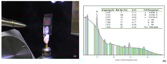 (a) Instrumental configuration of micro-XRD measurements, carried out directly on a polished thin-section, where two tesserae (one purple on the top—PD-PR1, and one light brown/amber on the bottom—PD-NC1) were mounted; note that the sample analysed is located within the black circle visible on the light brown/amber tessera; (b) micro-XRD pattern of tessera PD-NC1. In the table inset, list of peaks (showing d-spacing, relative intensity and hkl indices) and cell parameters of manganese-containing inclusion. Note that the peak identified by *, having dhkl equal to 3.36 Å, is assigned to cassiterite (the main opacifier of NC tesserae from Padova, and it is not considered in the present paper).