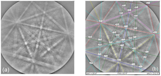 Representative EBSD pattern (a) of a manganese-containing inclusion from sample PD-NC1, indexed as neltnerite (b).