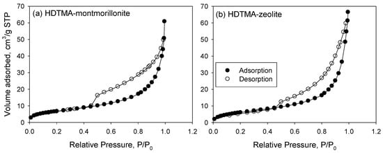 N2 adsorption–desorption isotherms of sorbents: (a) HDTMA-montmorillonite (HM) and (b) HDTMA-zeolite (HZ).