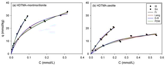 In summary, the sorption mechanisms are attributed to the (i) two-dimensional surface of the pseudo-organic medium sorption for HM and the interaction between anionic pharmaceuticals and the positively charged “head” of HDTMA for HZ and the (ii) pore-filling mechanism, which can be described by the PDM model, is also possible.