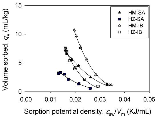 The PDM model was proposed to normalize the aqueous concentration to the water solubility of the compounds from the Polanyi theory. In this study, PDM was also attempted because solubility (S) and molar volume (Vm) are included as model parameters, considering that the solubility and molar volume of SA and IB are considerably different. The Polanyi theory has been used to describe the sorption process of organic compounds in highly meso- and microporous sorbents, which indicates that sorption occurs by the pore-filling mechanism [22]. In the PDM model (Equation (5)), the exponent b = 2 corresponds to a log-normal distribution of sorption energies [32]. The PDM model fitted well to the SA and IB sorption data (R2 > 0.963), as shown in Figure 2. The PDM model parameters are summarized in Table 4. It was observed that the maximum sorption capacity (qm) of SA was less than IB and the qm of HM (SA: 63.97 mmol/kg, IB: 412.08 mmol/kg) was higher than that of HZ (SA: 31.44 mmol/kg, IB: 307.55 mmol/kg).
