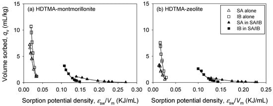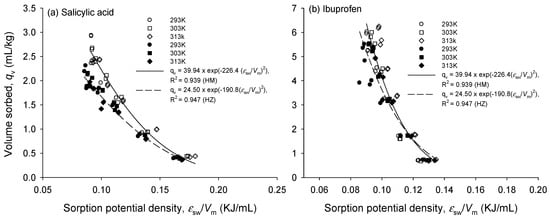 This “characteristic” curve can be used to identify whether the Polanyi theory mechanistically captures the sorption mechanism of pharmaceuticals by sorbents based on two assumptions. One assumption is that there is no molecular sieving effect. As mentioned before, this is true because the pore size of HM (124.2 Å) and HZ (97.31 Å; Table 3) was greater than the molecular size of SA (8.6 Å) and IB (6.7 Å; Table 1). The second assumption is that the molar volume of sorbates affects the sorption [55]. Figure 3 clearly shows the separation of the correlation curve of two pharmaceuticals (SA and IB). Several literature reported similar results for sorbents such as carbon sorbents [31], natural soil [27], polymers [23], and organoclays [20,21]. PDM was useful to describe the individual sorption isotherm data because Vm is the constant used in the regression analysis.