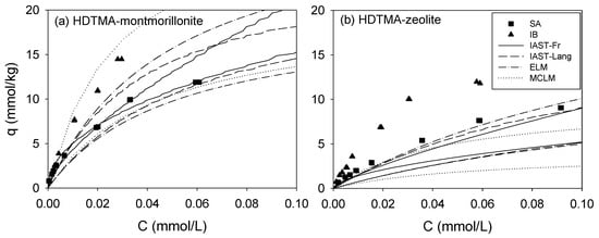 The sorption in HM occurs by the surface adsorption of SA and IB onto the two-dimensional surface of the pseudo-organic medium because the dominant speciation of SA and IB is anionic at pH 7 (>pKa) [50,51]. HDTMA modified aluminosilicate minerals (i.e., zeolite) can significantly enhance the sorption of IOCs, such as SA and IB used in this study, from aqueous solutions [42]. The hydrophobic benzene ring(s) in the SA and IB can be oriented to the inside of the HDTMA bilayers and stabilized by the hydrophobic interaction between the benzene ring(s) and the C16 tails of HDTMA cations [52]. For HZ, the interaction between anionic pharmaceuticals and HDTMA with a positively charged “head” on both inner and outer layers is a part of the sorption mechanism [47,52,53,54]. Dong et al. [52] reported that sorption of anionic speciation of bisphenol A onto HZ occurs by interaction with the positively charged HDTMA. Xie et al. [53] also explained that anion species of bisphenol A, p-chlorophenol, and phenol sorption onto HZ is attributed to Coulombic interaction. Sun et al. [47] and Krajišnik et al. [55] showed the net attractive interactions between anionic diclofenac and the positively charged HDTMA bilayer at the HZ surface.