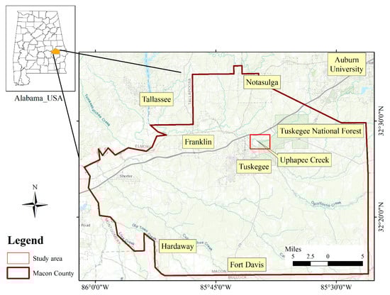 Location map of the study area in Macon County, Alabama. The red squire indicates the location where the wells were drilled, and naturally occurring arsenic-rich biogenic pyrite replaces wood fragments near the base of the coastal plain alluvial aquifer.