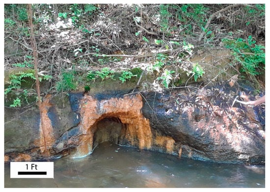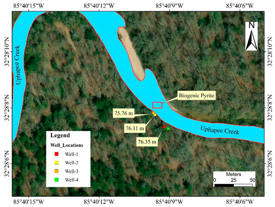 The study area is located within the Tuskegee National Forest in Macon County, Alabama (Figure 1). More specifically it is located along the bank of the Uphapee Creek, a tributary of the lower Tallapoosa River. In the northern side of the drainage basin, Appalachian Piedmont is present which consists of Precambrian-Paleozoic crystalline rocks. The creek flows through the Coastal Plain province of the Southeastern United States, more specifically east-central Alabama (northern Macon County) [17,45]. The Tallapoosa River and Uphapee Creek drain both Piedmont and Coastal Plain terranes, but Uphapee Creek is predominantly a Coastal Plain drainage, incised into the non-marine Upper Cretaceous Tuscaloosa Group [45]. Coastal Plain aquifer materials and associated sediments consist of non-marine alluvial deposits [46]. The sediments are characterized by petrified and lignitic wood fragments, which are commonly associated with crystalline pyrite with no signs of visible organic matter [45]. These undifferentiated sediments consisting of gravel, sand, silt, and lignitic wood, which were derived from the weathering and erosion of the Appalachians; and were deposited in a Holocene floodplain [26]. Weathering of a variety of crystalline rock types may lead to release of As and other metals/metalloids to the hydrosphere.