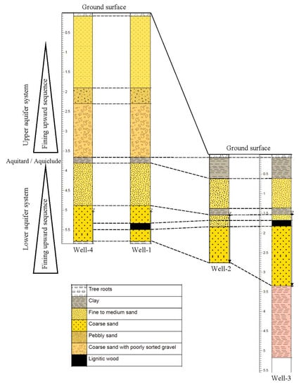 Well logs were prepared based on the visual inspection of the cuttings brought to surface during drilling (Figure 3). The logs showed a consistent lithology among the wells. Two fining upward sequences were identified. The lithology indicates the presence of two aquifers and the lower confined aquifer was the focus of this study.
