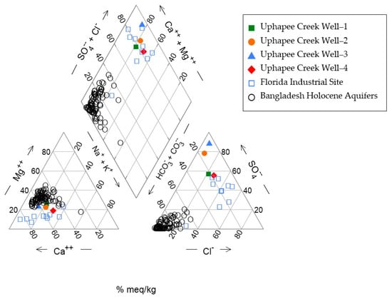 A piper diagram illustrating the main hydrochemical features of the Macon County, Alabama fluvial aquifer system. It also presents groundwater data from Florida (industrial site) [51], and Bangladesh [6].