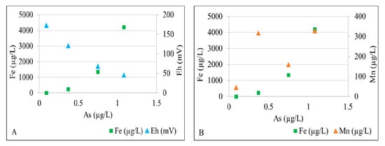 X-Y plot showing (A) a relation of arsenic concentrations with iron concentrations and Eh values, and (B) a relation of arsenic concentrations with iron and manganese concentrations in different wells.