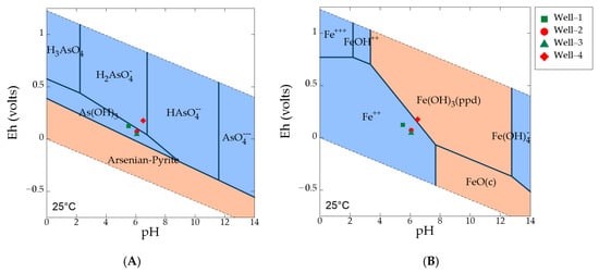 (A) Eh-pH diagram showing As species under various redox conditions with plotted groundwater samples from the wells, where As log activity is −4, for both Fe and SO42− log activity is −3, and scorodite (As oxides) is suppressed; (B) Eh-pH diagram showing stable Fe species under various redox conditions, where Fe log activity is −4, and goethite, hematite, magnetite are suppressed. Blue fields designate aqueous phases and pink fields are solid phases.