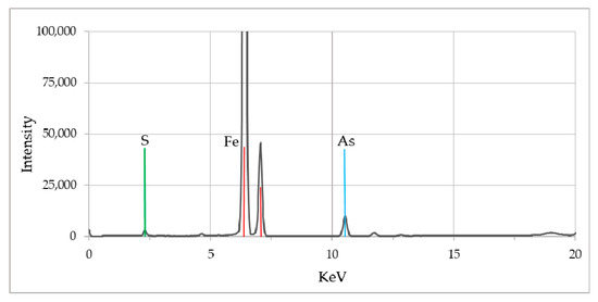 The X-ray diffraction (XRD) analyses confirmed that pyrites samples are naturally formed arsenian-pyrite. The XRD spectrum of the pyrite samples (Figure 10) showed that peaks closely match with arsenian-pyrite (at 2θ = 28.5°, 33.0°, 37.0°, 40.7°, 47.3°, and 56.2°) as reported for lignite from the Czech Republic [56]. The peaks match with peak positions of pure pyrite (COD 5000115, COD 9013069) and arsenian-pyrite (COD 9013070) according to the crystallography open database (COD).