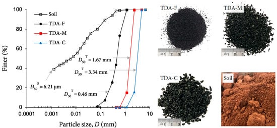 Referring to Figure 1; the particles of TDA-F (D50T = 0.46 mm), TDA-M (D50T = 1.67 mm) and TDA-C (D50T = 3.34 mm) approximated in size to those of fine (0.075–0.425 mm), medium (0.425–2 mm) and coarse (2–4.75 mm) sands, respectively. In view of the coefficients of uniformity and curvature values reported in Table 2, the gradation of all three TDA materials investigated can be classified in accordance with the USCS criteria as equivalent to poorly-graded sand (SP). Furthermore, the specific gravity of TDA-F, TDA-M and TDA-C were, respectively, found to be GsT = 1.08, 1.10 and 1.11; these values are approximately 2.5-fold lower than that of the test soil (GsS = 2.77). As specified in the manufacturer’s literature, the chemical composition of the three TDA variants was dominated by styrene–butadiene copolymer and carbon black, with mass fractions of 55% and 25–35%, respectively; the secondary constitutes included 5–20% acetone extract, 2–3% zinc oxide and 1–3% sulfur. Other physical properties for the three TDA variants included a softening point of 170 °C, and a maximum water adsorption capacity of 4%.