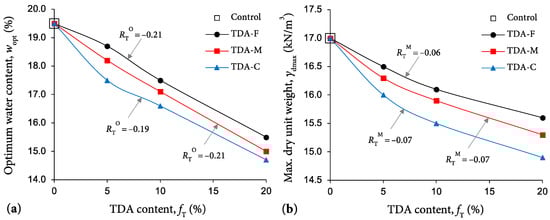 Variations of (a) optimum water content wopt and (b) maximum dry unit weight γdmax against TDA content fT for the tested mix designs.