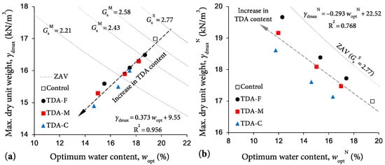 where γdmaxN = normalized maximum dry unit weight; woptN = normalized optimum water content; GsS = specific gravity of soil solids (=2.77, as reported in Table 1); and GsM = specific gravity of the soil–TDA blends, obtained by Equation (1) and reported in Table 3.