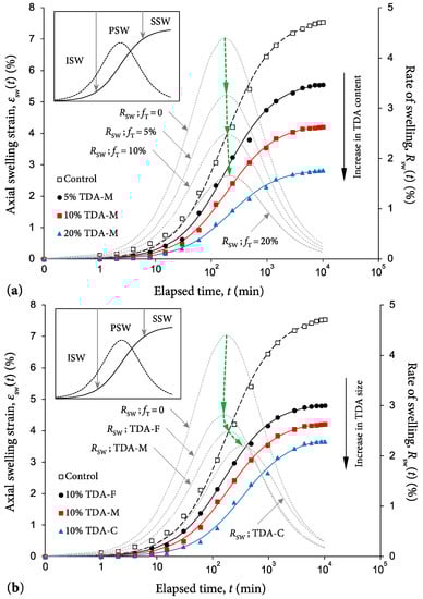 In view of the above, the swelling rate Rsw(t) was found to develop into a bell-shaped curve, peaking within the PSW region (at the inflection point of the S-shaped curve) and then decreasing as the swelling process transitions from the PSW to the SSW stage. Referring to Figure 4a, which highlights the effects of TDA content on the swell–time behavior; at any given elapsed time of swelling, the greater the TDA content, the lower the magnitude and rate of swelling. Similarly, for any given TDA content, an increase in TDA size was found to decrease the soil’s swelling strain magnitude and rate, albeit to lesser degrees (see Figure 4b). Unlike TDA content, the role of TDA gradation/size in reducing the rate of swelling was notable only within the ISW and PSW regions; for the SSW stage, the rate of swelling for the three TDA gradations examined in this study (see Figure 1) was found to be rather similar. As demonstrated in Figure 4a, for any given TDA size, changes in the TDA content within the investigated range of 5% ≤ fT ≤ 20% did not significantly affect the time required to achieve the maximum swelling rate. On the contrary, the coarser the TDA material, the longer the time required to attain the maximum swelling rate (see Figure 4b).