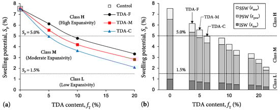 In view of the three swelling stages described above, the swelling potential can be subdivided into the initial, primary and secondary swelling strains—that is, SP = εisw + εpsw + εssw. Figure 5b illustrates the variations of εisw, εpsw and εssw against TDA content for the tested mix designs. In general, the variations of the initial, primary and secondary swelling strains were all found to follow a trend similar to that observed for the swelling potential. The swelling potential can be employed to specify the soil degree of expansivity []. Corresponding classifications for the unamended soil and various TDA-blended samples—obtained in accordance with the classification framework suggested by Seed et al. [] (see Table A1 of Appendix A)—are outlined in Figure 5. The unamended soil sample can be classified as “highly expansive”. The samples containing 5% TDA-F and TDA-M produced the same “highly expansive” classification, whereas the addition of 5% TDA-C led to an improved classification of “moderately expansive”. Beyond 5% TDA, regardless of the TDA size investigated, all samples were found to be “moderately expansive”.