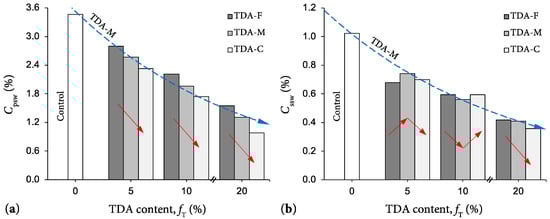 Variations of the (a) primary swelling and (b) secondary swelling coefficients (i.e., Cpsw and Cssw) against TDA content fT for the tested mix designs.
