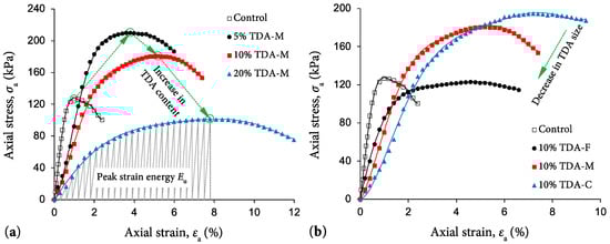 Typical stress–strain curves for the unamended soil (control) and various TDA-blended samples prepared with TDA-M are presented in Figure 7a. The constitutive response for the unamended soil sample exhibited a rise–fall trace with a visually-identifiable peak point, signifying a strain-softening behavior leading to a brittle failure mode. As a result of increasing the TDA content, the stress–strain locus progressively transitioned towards a strain-hardening (or more ductile) character, as reflected in the axial strain at peak parameter increasing in magnitude with the TDA content (follow the arrowed lines in Figure 7a). This transitional mechanism can be ascribed to the lower stiffness and higher deformability of the soil solids–TDA agglomerations compared with that of the aggregated soil solids of the unamended soil (control) [,,]. Referring to Figure 7b, which highlights the effects of TDA gradation on the stress–strain response; an increase in TDA size was also found to enhance the soil’s axial strain at peak and hence its strain-hardening character (see the arrowed line in Figure 7b).
