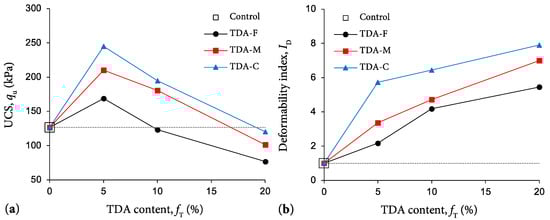 The variations of the deformability index against TDA content for the tested mix designs are presented in Figure 8b. Unlike the UCS, the deformability index exhibited a monotonically increasing trend with the TDA content, and as such, the greater the TDA content, the more ductile the soil’s response to unconfined compression. By definition, the unamended soil sample has a deformability index of ID = 1.0 (εuN = 1.1%). As typical cases, the samples prepared with 5%, 10% and 20% TDA-M resulted in ID = 3.4, 4.7 and 7.0 (εuT = 3.7%, 5.2% and 7.7%), respectively. Interestingly, an increase in TDA size was also found to considerably enhance composite ductility. For instance, the samples blended with 10% TDA-F, TDA-M and TDA-C resulted in ID = 4.2, 4.7 and 6.5 (εuT = 4.6%, 5.2% and 7.1%), respectively.