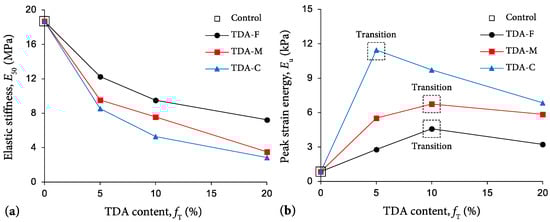 The variations of peak strain energy Eu—defined as the area under the stress–strain curve up to mobilization of the UCS or qu (e.g., see the shaded area for 20% TDA-M in Figure 7a), which signifies the sample’s energy absorption capacity, and hence its toughness, up to that point []—against TDA content for the tested mix designs are presented in Figure 9b. Simpson’s rule for numerical integration was used to calculate the area under the stress–strain curve up to mobilization of the UCS (and hence the Eu parameter). It should be mentioned that, with the axial stress σa in kPa and the dimensionless form of the axial strain εa (i.e., not in %) used in these calculations, the Eu parameter is obtained in kPa. By definition, an increase in toughness can be achieved by increases in the UCS and/or the axial strain at peak [,]. As demonstrated in Figure 8, the deformability index (and hence the axial strain at peak) was consistently in favor of higher TDA contents, whereas TDA contents greater than 5% adversely influenced the UCS. In view of these opposing actions, for any given TDA size, the role of TDA content in improving the toughness was positive only up to a certain (or optimum) content, beyond which the toughness exhibited a decreasing trend with the TDA content. In this regard, the optimum TDA content was found to be 5% for TDA-C, and 10% for both TDA-M and TDA-F (see the dotted squares denoted as “Transition” in Figure 9b). These results indicate that the magnitude of reduction associated with the UCS at fT > 5% for TDA-C and fT > 10% for both TDA-M and TDA-F outweighed the magnitude of improvement associated with the axial strain at peak (or deformability index). Moreover, for any given TDA content, an increase in TDA size enhanced composite toughness by way of increasing both the UCS and the axial strain at peak—that is, the coarser the TDA particles, the higher the UCS and ductility of the soil–TDA blends (see Figure 8). The unamended soil sample resulted in Eu = 0.9 kPa. When blended with 5%, 10% and 20% TDA-M, for instance, the peak strain energy changed to 5.5 kPa, 6.8 kPa and 5.8 kPa, respectively. As typical cases highlighting the positive effects of TDA size, the samples prepared with 10% TDA-F, TDA-M and TDA-C produced Eu values of 4.6 kPa, 6.8 kPa and 9.7 kPa, respectively.