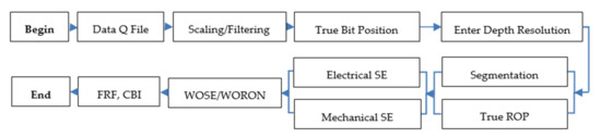 Flowchart of compensated blastability index (CBI) calculation algorithm [1], where: Q file—Recorded Log data parameters; ROP—Rate of penetration; SE—Specific Energy; WORON—is the monitored weight on the bit over penetration rate per revolution (WOB / [ROP / RS]); WOB—weight on the bit; RS—Rotary Speed; WOSE—examines the ratio between WORON and SE (WORON / SE × D); and D—bit diameter.