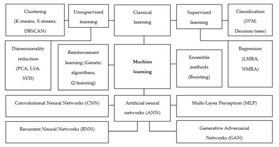 Classification of machine learning methods, where: DBSCAN—Density-based spatial clustering of applications with noise; SVM—support vector machine; PCA—principal component analysis; LMRA—Linear multiple regression analysis; NMRA—Nonlinear multiple regression analysis; LSA—Latent semantic analysis; and SVD—Singular value decomposition).