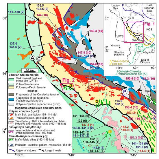 Geology of the central part of the Verkhoyansk–Kolyma folded area with the main tectonic units, Jurassic–Cretaceous magmatism, and sites of investigations. Compiled using [6,39,43]. Colored numbers show ages in Ma: red—U–Pb SHRIMP-II method, magenta—U–Pb SHRIMP-RG method; blue—Ar–Ar method; black—Rb–Sr method (numbers in brackets come from the literature: (1)—[44]; (2)—[45]; (3)—[13]; (4)—[12]; (5)—[46]; (6)—[18]; (7)—[6]; (8)—[14]; (9)—[47]; (10)—[19]; (11)—[48]). Inset: VFTB––Verkhoyansk fold and thrust belt; OT—Okhotsk terrane; investigation sites are marked as numbers in yellow circles: 1—Malo–Tarynskoye site; 2—Tin–Yuryuete site; 3—Vyun deposit and Shumniy occurrence; sutures: P—Polousniy-Kolyma; S—South Anyui; thrusts: A—Adycha-Taryn; C—Chakry–Indigirka.