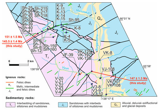 - Fridovsky, V.Y.; Yakovleva, K.Y.; Vernikovskaya, A.E.; Vernikovsky, V.A.; Rodionov, N.V.; Lokhov, K.I. Late Jurassic (151–147 Ma) Dike Magmatism of the Northeastern Margin of the Siberian Craton. Dokl. Earth Sci. 2020, 491, 117–120. [Google Scholar] [CrossRef]