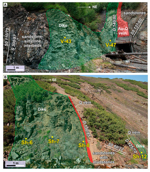 Photographs of dated dikes and locations of samples: (A) Vyun deposit, (B) Shumniy ore occurrence. Attitude: S0—bedding, S—fault, D—dike.