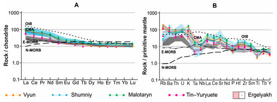 REE diagram (A) and spider diagram (B) for the studied igneous rocks. Chondrite and primitive mantle normalizing values were from [62]. Blue and grey fields—concentrations for Grenada Island (Lesser Antilles island arc) basalts with, respectively, a peridotite–pyroxenite source (5% mantle wedge melting) and a mainly peridotite source (25% Mg-enriched mantle wedge melting) [63]. Concentrations from the Ergelyakh pluton granite–porphyry and granodiorite–porphyry were from [13].