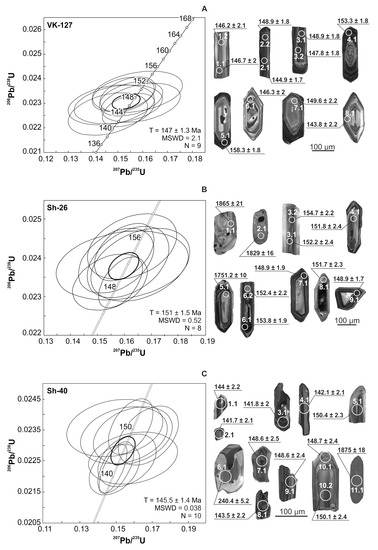 The zircons from the trachyandesite sample Sh-40 (n = 10) were colorless or light-yellow, clear, idiomorphic, and sub-idiomorphic (Figure 7C) 30 to 120 μm long (elongation coefficient Kelong = 1–4). In the CL images, the zircons had a weak or moderate brightness with magmatic oscillatory zoning. The individual crystals (6.1) had mostly sectorial zoning. Measurements allowed defining a cluster (spots 1.1, 2.1, 3.1, 4.1, 5.1, 7.1, 8.1, 9.1, and 10.1/10.2), in which the U contents varied from 329 to 1584 ppm (647 ppm average), Th contents from 105 to 522 ppm, the Th/U ratio was in the range 0.25–0.6 (Table 5). The common lead fraction (206Pbc) was between 0.05% and 1.68%. Excluding spots 6.1 and 11.1 the zircons yielded a Concordia age of 145.5 ± 1.4 Ma (MSWD = 0.038, probability 0.85), which we accepted as the crystallization age for the andesite. One grain (spot 6.1) was clear and prismatic with smoothed out faces. This zircon had low U content (65 ppm), Th = 124 ppm, and a high Th/U ratio of 1.98%. The date obtained for this grain was 240.4 ± 5.2 Ma. Another grain (spot 11.1) was elongated (150 μm) and mainly faced by prism (100). Like the second group zircons from the granite–porphyry sample, this grain was a xenocryst with U and Th contents 265 ppm and 29 ppm, and a Th/U ratio of 1.13. The 207Pb/206Pb age obtained for this zircon w 1875 ± 18 Ma.