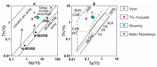 Tectonic setting discrimination diagrams for the mafic igneous rocks: (A) Th/Yb versus Nb/Yb from [66]; (B) Th/Yb versus Ta/Yb from [67]. All data points on this diagram are from this study. Abbreviations are types of mafic volcanic rocks: MORBs—middle ocean ridge basalts; N-MORBs—normal middle ocean ridge basalts; E-MORBs—enriched middle ocean ridge basalts; OIBs—ocean islands basalts; WPBs—within plates basalts; ALK—alkalic; TH—oceanic tholeiitic; VABs—volcanic arc basalts; IAT—island arc tholeiitic; CABs—calk-alkaline basalts; SHO—shoshonitic; TRs—transitions between ALK and TH.