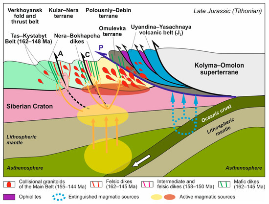 The formation of the mafic, intermediate, and felsic rocks of the dikes of the Nera–Bokhapcha complex took place prior to and synchronously with the collision: from the Oxfordian, at least 162 Ma, according to Rb–Sr geochronology [14] and up to the latest Tithonian, which is confirmed by our new U–Pb SHRIMP-II data for zircons from felsic rocks, 151–145 Ma. Available Ar–Ar dates (for amphibole) [45] and U–Pb SHRIMP-II zircon dates [44] for the intermediate and felsic dikes of the Tas–Kystabyt belt are also in the range of 162–145 Ma; however, assigning the igneous rocks of this belt to the same complex as the Nera–Bokhapcha rocks needs to be further verified.