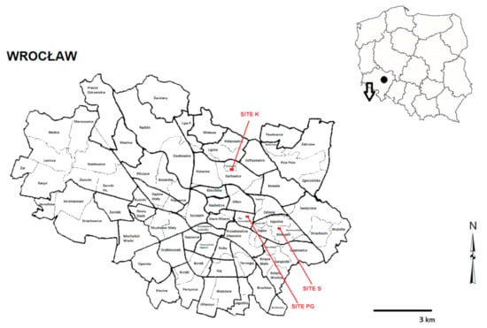 The study was conducted in Wrocław, the largest city in south-west Poland, in Lower Silesia. All samples were collected at three sites located in different neighborhoods (denoted S, PG, and K) (Figure 1). Site S (Siemiradzkiego st.) was situated in a very quiet area of Wroclaw, with a small number of municipal sources of air pollutants (i.e., exhaust and non-exhaust emission from road traffic, stoves); site PG was in Grunwaldzki Square, a centrally located main interchange with heavy motor traffic; and site K (Kamieńskiego st.) was located in a prosthetic laboratory situated near a moderately busy road, surrounded by other service facilities and new tenement houses. A detailed description of the sites is presented in Table 1.