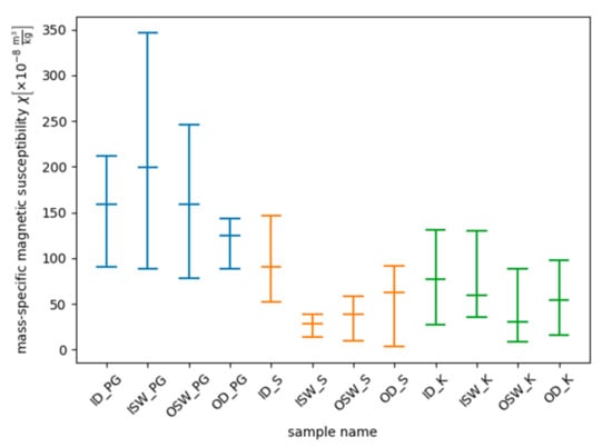 Mass-specific susceptibility values for samples (ID—indoor dust; ISW—indoor spider web; OSW—outdoor spider web; OD—outdoor dust) collected at different sites (PG—Grunwaldzki Square; S—Siemiradzkiego; K—Kamieńskiego). The whiskers range from minimum to maximum values, and the horizontal bars represent mean values.
