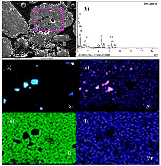 EDS elemental mapping micrographs of the as-received ilmenite particle. (a) Cross sectioned area, (b) EDX spectra, (c) Silica, (d) Aluminum, (e) Titanium, (f) Managanese.