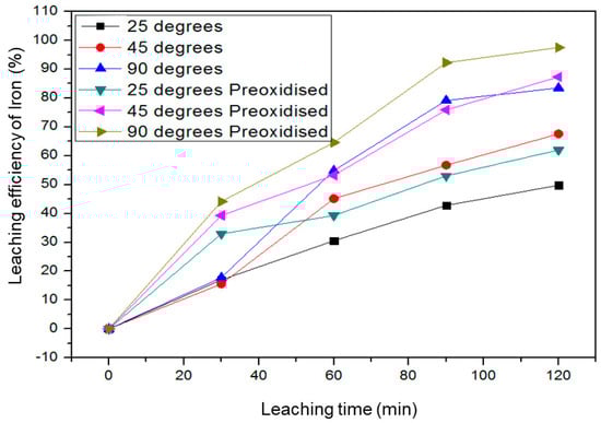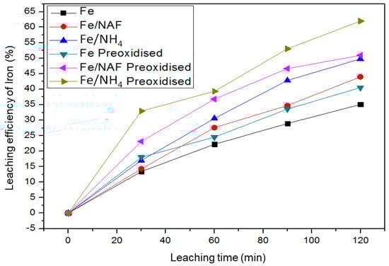 It is well established that the additives and reductants significantly affect the leaching efficiency of ilmenite from the electrochemical results. The response of as-received and pre-oxidized ilmenite to additive and reductive leaching was studied in a series of test works performed at atmospheric conditions. Figure 10 shows the leaching efficiency of ilmenite over time. It can be observed that when only metallic iron is added to the solution, the leaching efficiency of ilmenite is the lowest for both as-received and pre-oxidized samples. The NH4HF4 substantially increased the as-received ilmenite leaching efficiency. The active HF component etches the passivation layer formed during leaching allowing interface reaction to continue increasing the dissolution rate of ilmenite. It can be noted that the pre-oxidized ilmenite response to leaching supersedes that of the as-received ilmenite at atmospheric conditions. In the same Figure 10, the leaching efficiency of the pre-oxidized ilmenite for all additives increased compared to the as-received ilmenite. The porous structure attained during the pre-oxidation step favors the solid–liquid interaction process during the ilmenite leaching process. The micropores enhance the mass transfer rate of leaching reagents through the ferric oxide layer promoting the dissolution reaction. Therefore, this validates the assertion by Liu and Xiang [26] that the exposure of hematite through pre-oxidation promotes dissolution and untreated ilmenite has low reactivity to HCl. Mahamoud et al. [19] reported that the addition of metallic iron reduces the dissolved Fe3+ to Fe2+ and significantly improves the iron dissolution rate.