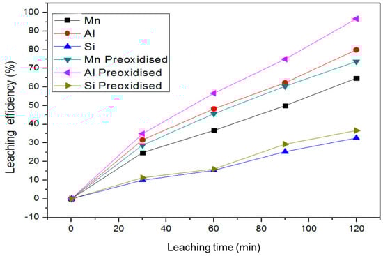 Manganese, alumina, and silica form part of the crystalline structure of ilmenite coexisting as intra and inter impurities. In application, these impurities affect the quality of the final product. While maintaining the same leaching conditions, the behavior of the impurities was observed. Figure 12 presents the leaching characteristics of impurities associated with ilmenite. It can be observed that alumina had the highest leaching efficiency, which can be attributed to alumina’s deposition characteristics. When observing the ilmenite crystal structure (Figure 5, Figure 6 and Figure 7), the alumina deposited on the intra part of the crystallographic structure, making it easy to be leached out.