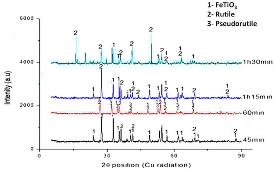 Figure 13 shows the mineral phase constitution of the as-received ilmenite leached at the optimum condition at different time intervals from 45 min to 1 h 30 min, at 90 °C. Compared with Figure 3 (as-received ilmenite XRD diffractogram), the x-ray diffractograms of the residue samples were studied after each leaching time interval. New diffraction peaks appeared after a 45-min leach indicating surfacing rutile peaks as ilmenite dissolution occurs. Intermediate phases transformed into rutile; however, most unreacted ilmenite peak intensity is visible in the material.