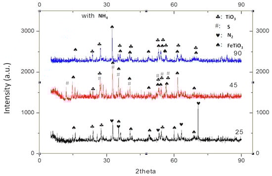 Figure 15 shows the phase pattern of the pre-oxidized ilmenite leached in the presence of ammonium additives. It can be observed that at 25 °C there is a higher peak ilmenite peak intensity with few picks of TiO2 and nitrogen. The peak intensity for ilmenite reduces as temperature increases; there are phase changes as the overlap between sulfur, TiO2, and ilmenite observed when leaching was conducted at 45 °C. At 90 °C, a precise observation of the dominant TiO2 phase constitution confirms the assertion that the pre-oxidized ilmenite leached successfully in the presence of ammonium. When contrasting with the XRD pattern for the leached as-received ilmenite, pre-oxidized leached without additives, the additive leach shows a significant increase in the TiO2 as temperature increases. To have a fully comprehensive understanding of how the crystallographic orientation was affected by leaching, a further mineralogical investigation was required.