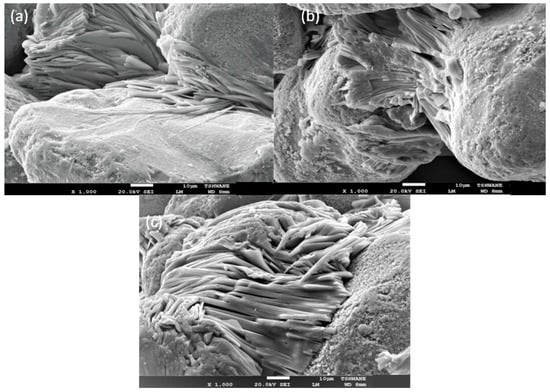 Electron micrographs of the as-received ilmenite leaching residues at different temperature intervals (a) 25 °C, (b) 45 °C, and (c) 90 °C.