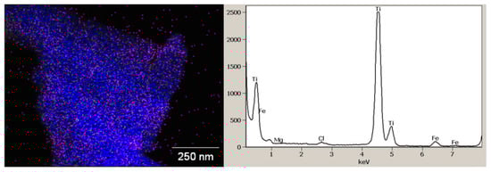 Similar to the XRD and XRF results, the EDS elemental mapping micrographs (Figure 7) show the presence of impurity inclusion within the ilmenite structure, confirming the assertion of the material mineralogical orientation has been altered. According to Buick and Dunlop [22], ilmenites have corundum structures with oxygen anions in the hexagonal tightly packed lattice and Fe and Ti cations occupying two-thirds of the interstices. Typically the ilmenite alterations and deposits in the Richards Bay area have chemical compositions containing a wide range of elements (Ca2+, Mn2+, Fe3+), which can substitute the Fe2+ in the lattice structure [23]. The manganese substitutions in the weathering transformation phase (pseudorutile) occur in the range of 0.6–1%, which is similar to what is observed in the chemical composition of this material [24].