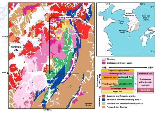 Geological map and stratigraphy of the Neungju Basin (modified after [,,,,,,]). Precambrian granitic gneiss complexes broadly surround the basin. Paleozoic metasedimentary rocks are narrowly distributed along the eastern and southeastern basin margins. Triassic to Jurassic granites are mostly distributed on the northern and western side of the basin. In contrast to the northern part of the basin where epiclastic sediments were mainly deposited, the southern part of the basin was filled with volcaniclastic deposits, forming a volcaniclastic terrane.