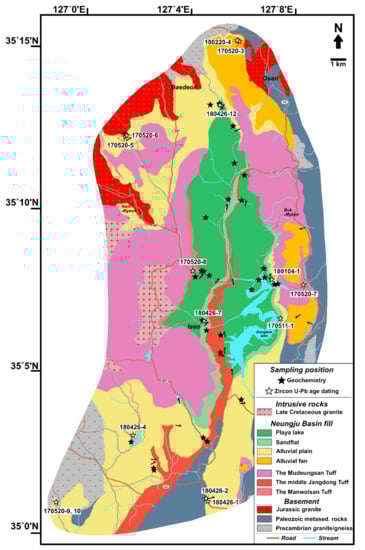 Spatial distribution of depositional environments in present outcrops of the Neungju Basin (modified after []). Sixteen mudstone samples were collected from the proximal depositional environments (alluvial plain and sandflat), and fourteen mudstone samples from the distal environment (playa lake). Samples were also collected from conglomerate, sandstone, and tuff and analyzed in terms of zircon U-Pb geochronology to constrain sediment provenance and the depositional age of the basin. Sampling positions for geochemical analysis and zircon U-Pb dating are indicated by closed and open stars, respectively. Black arrows indicate paleocurrent direction [].