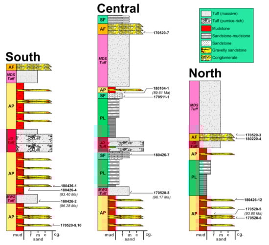 Schematic composite section of the study area (modified from []). AF = alluvial fan; AP = alluvial plain; SF = sandflat; PL = playa lake. The amalgamated tuff beds of tens to hundreds of meters thick is represented by MWS tuff = the Manwolsan Tuff; JD Tuff = the middle Jangdong Tuff; MDS Tuff = the Mudeungsan Tuff. Sample locations of the zircon U-Pb analyses are marked.