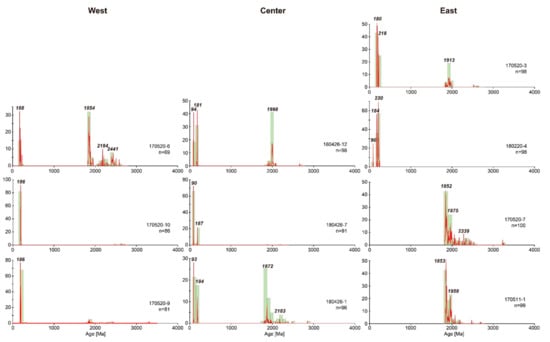 The detrital zircon age populations of the Neungju Basin sediments show variation according to the sample locations (Figure 2, Figure 3 and Figure 4). The samples near the western and eastern margins have prominent zircon age peaks indicating their derivation from the adjacent basement rocks. In the northwestern part of the study area, sample 170520-6 showed Jurassic to Triassic ages between 173 and 228 Ma with an age peak at 188 Ma, and Paleoproterozoic to Archean ages between 1830 and 2596 Ma with major age peaks at 1854, 2184, and 2441 Ma. The southwestern samples (170520-9 and 170520-10) are exclusively comprised of Jurassic zircons (peaks at 186 Ma) with no Cretaceous but minor Paleoproterozoic grains. In the northeastern part of the basin, the zircon ages of sample 170520-3 mainly consist of Jurassic to Triassic ages between 178 and 226 Ma with an age peak at 180 and 218 Ma and Paleoproterozoic to Archean ages between 1939 and 2620 Ma with an age peak at 1913 Ma. Sample 180220-4 contains Cretaceous zircon grains between 89 and 99 Ma (5 grains), Jurassic to Triassic zircons between 172 and 251 Ma with prominent age peaks at 220 Ma. In the eastern part of the basin, the zircon age spectra of samples 170511-1 and 170520-7 comprise exclusively of Paleoproterozoic zircons with minor Archean. Sample 170511-1 has zircon grains mainly formed in 1905–2690 Ma with age peaks at 1853 and 1958 Ma. The zircon ages of sample 170520-7 consist of Paleoproterozoic zircons between 1846 and 3254 Ma with prominent age peaks at 1852, 1975, and 2339 Ma.