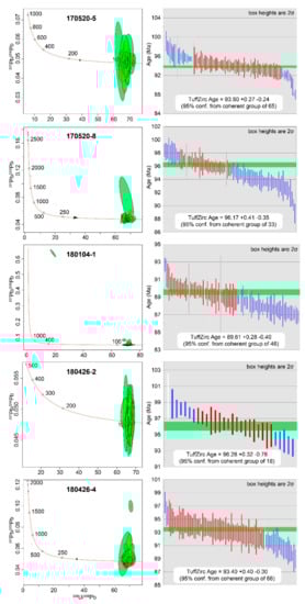 The tuff samples (170520-5, 170520-8, 180426-2, 180426-4, and 180104-1) show their weighted mean ages as ca. 93.80 Ma, 96.17 Ma, 96.28 Ma, 93.40 Ma, and 89.61 Ma, respectively (Table S1 and Figure 6). Each sample contains several older zircon grains ranging in age from Late Archean (2593 Ma) to Jurassic (164 Ma). All the tuff samples have different eruption ages, indicative of frequent magmatic activity in the area adjacent to the Neungju Basin during its deposition.