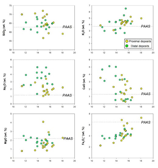 The compositional contrast between the proximal and distal deposits can be explained based on the data collected from zircon age dating. The zircon age data indicate that Jurassic to Triassic granites and Precambrian metamorphic rocks as the primary sources in the marginal areas where alluvial drainage systems transported sediment detritus from the adjacent source areas. These source rocks have similar characteristics in major element composition []. Thus, the proximal deposits show similar major element composition regardless of variations in the relative contribution of Jurassic to Triassic granites and Precambrian metamorphic rocks. In contrast, the zircon age data indicate that considerable amounts of sediments were transported from the southern Cretaceous volcaniclastic terrane to the central playa lake. Cretaceous volcanic activity in the Neungju Basin areas was generated from calk-alkaline magma, resulting in the deposition of felsic pyroclastic, andesitic to dacitic rocks, and rhyolite [,,]. Although various types of volcanic rocks were formed, they are characterized by abundant plagioclase content. Thus, it would be natural that the distal deposits show high Na2O content than the proximal deposits.