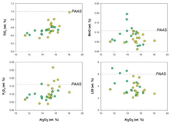 - Ryan, K.M.; Williams, D.M. Testing the reliability of discrimination diagrams for determining the tectonic depositional environment of ancient sedimentary basins. Chem. Geol. 2007, 242, 103–125. [Google Scholar] [CrossRef]